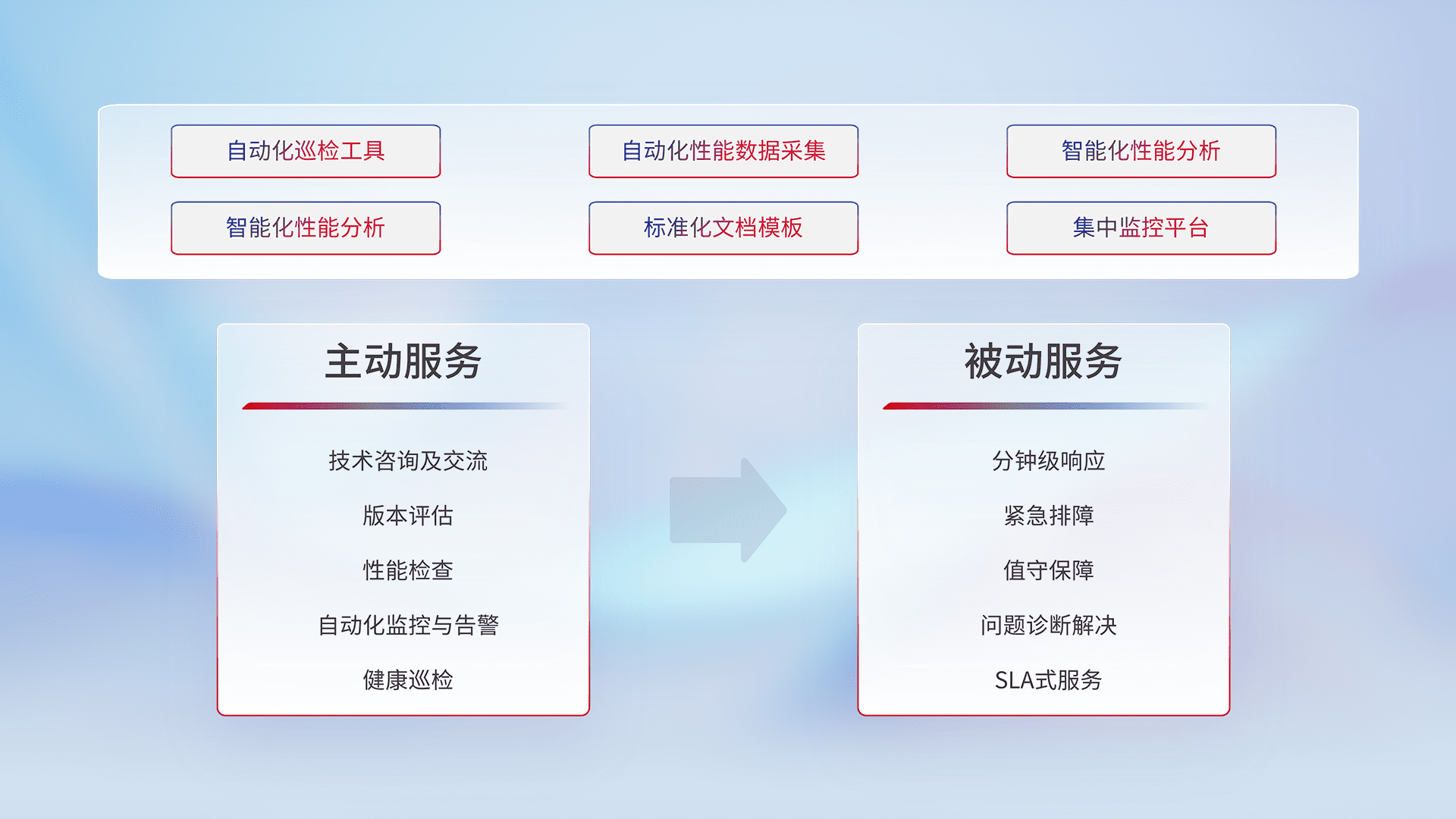 智能化工具和标准化文档,,保障服务质量,,,,提供主动服务(包含技术咨询、、、、版本评估、、、性能检查、、、自动化监控与告警、、、、健康巡检)和被动服务包含(分钟级响应、、、、紧急排障、、、、值守保障、、、问题诊断解决、、SLA服务)。。。。
